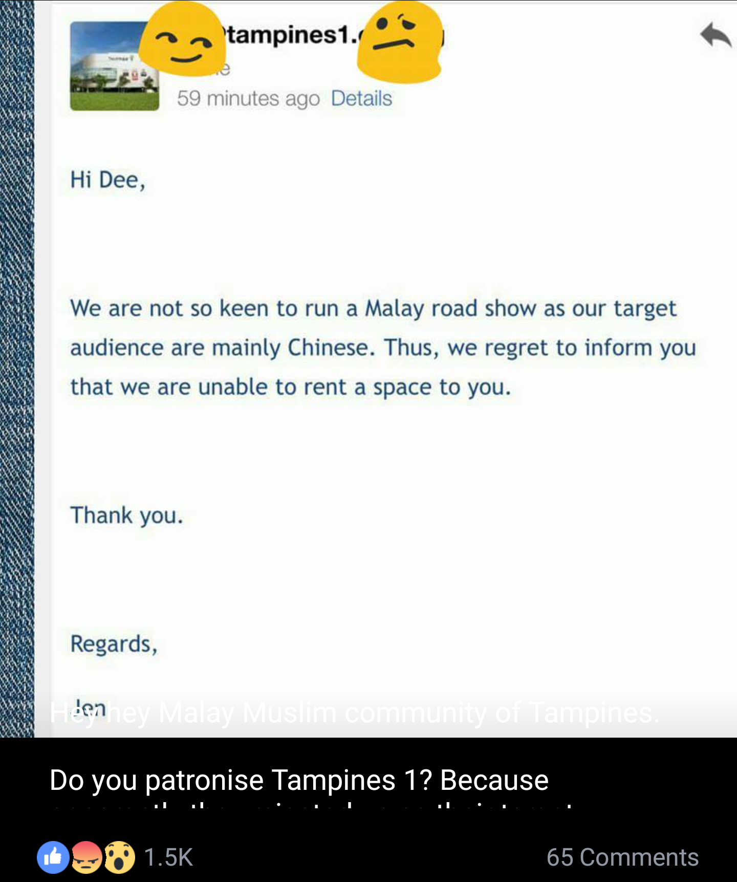 The response was, “Hi Dee, We are not so keen to run a Malay road show as our target audience are mainly Chinese. Thus, we regret to inform you that we are unable to rent a space to you.” [source]